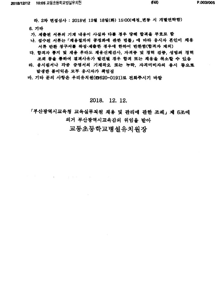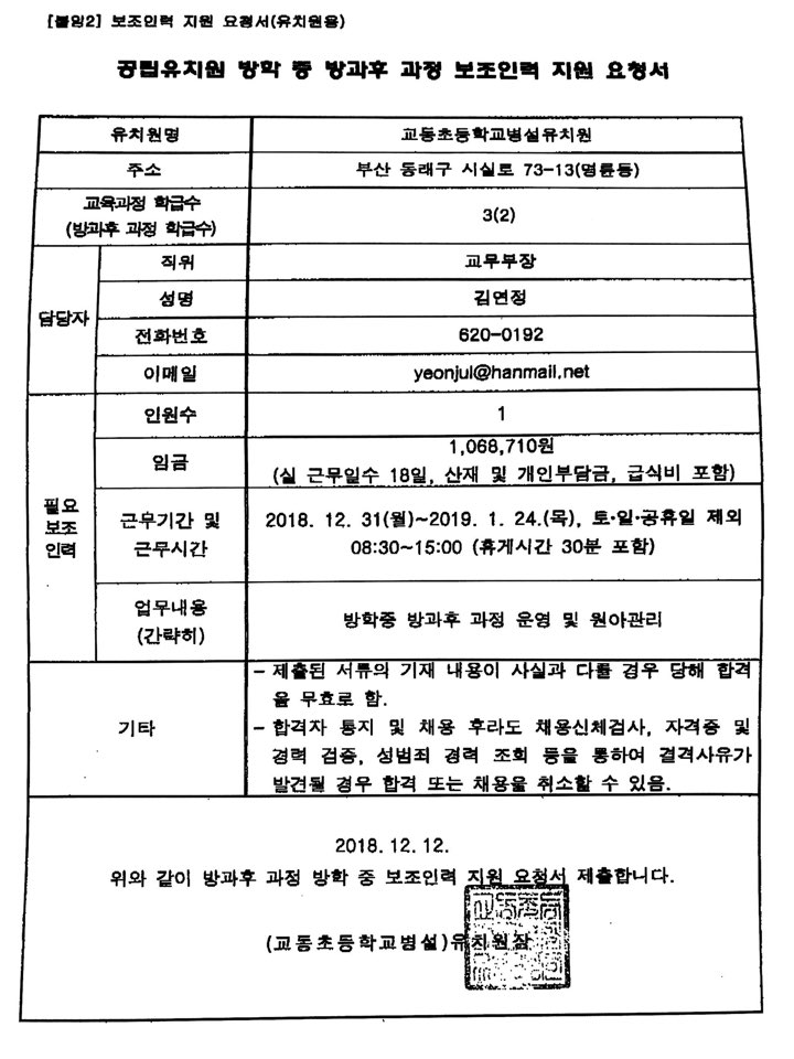 교동초등학교병설유치원 방과후 과정 보조인력 지원 요청서