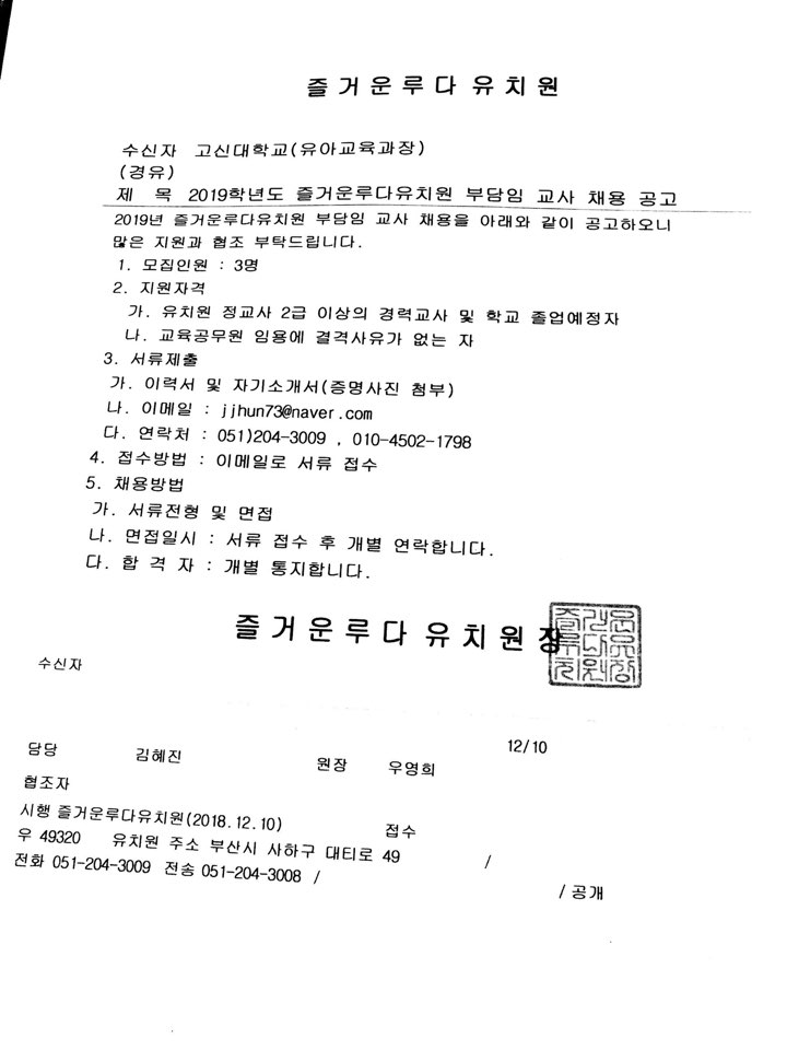 즐거운루다유치원 신규교사 채용 의뢰