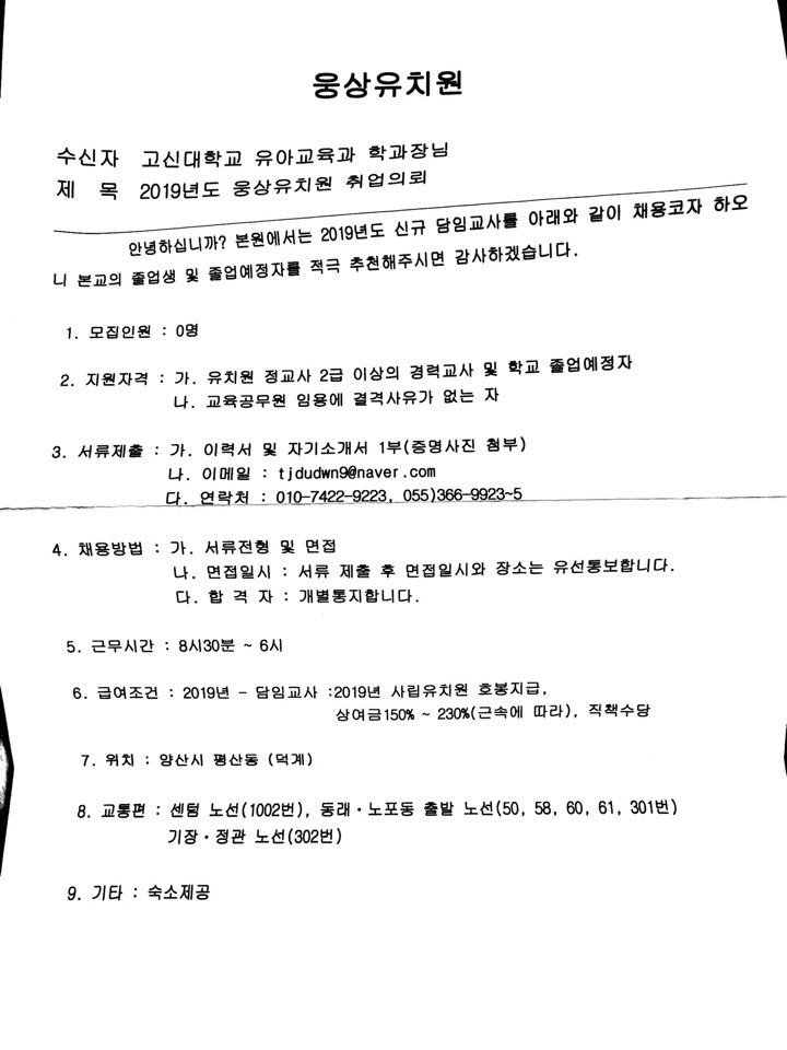웅상유치원 신규교사 채용 의뢰