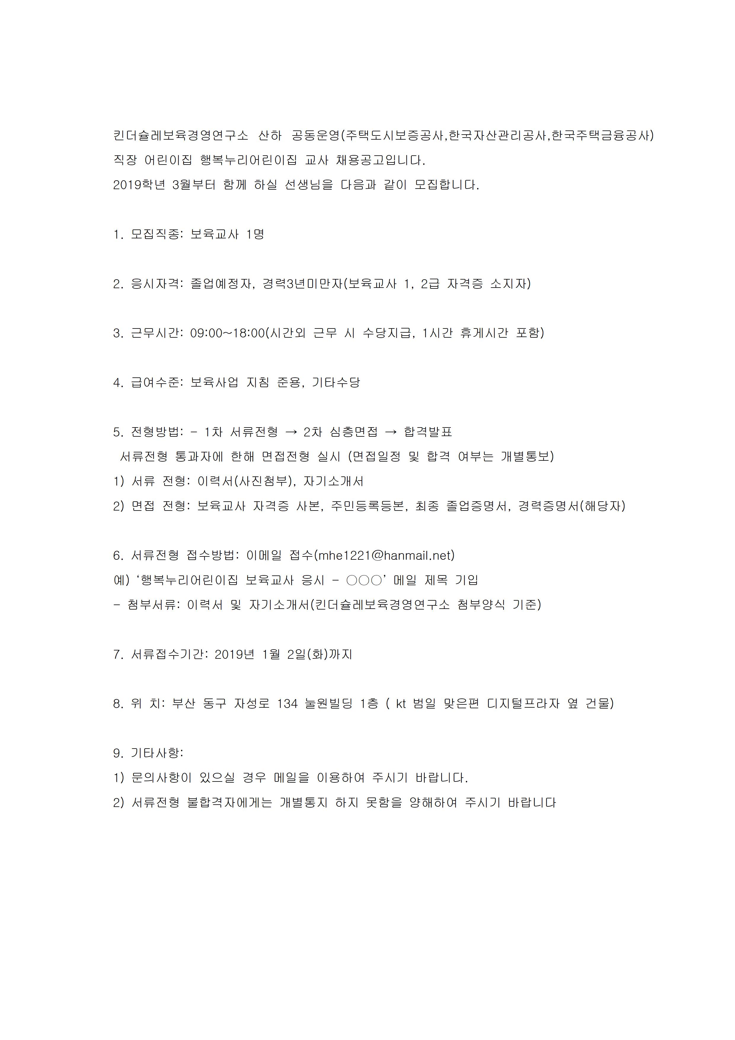 부산대학교 보육종합센터 위탁 운영 어린이집 보육교사 신규교사 채용 의뢰