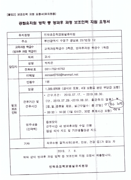 민락초등학교 병설유치원 방학 중 방과후 과정 보조인력 지원 요청